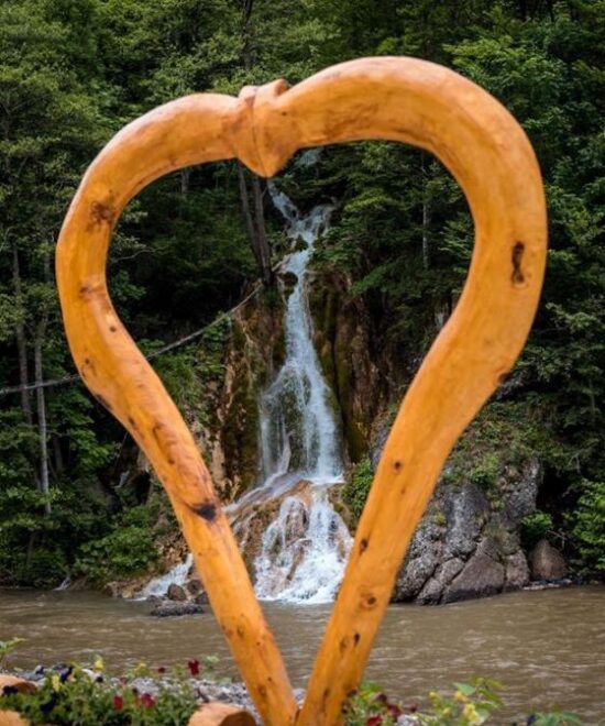 Cascada Sipote e locul unde oprim pentru poze (cu cascada, inima mare de lemn, sau cu ursul sculptat de localncii mestesugari)